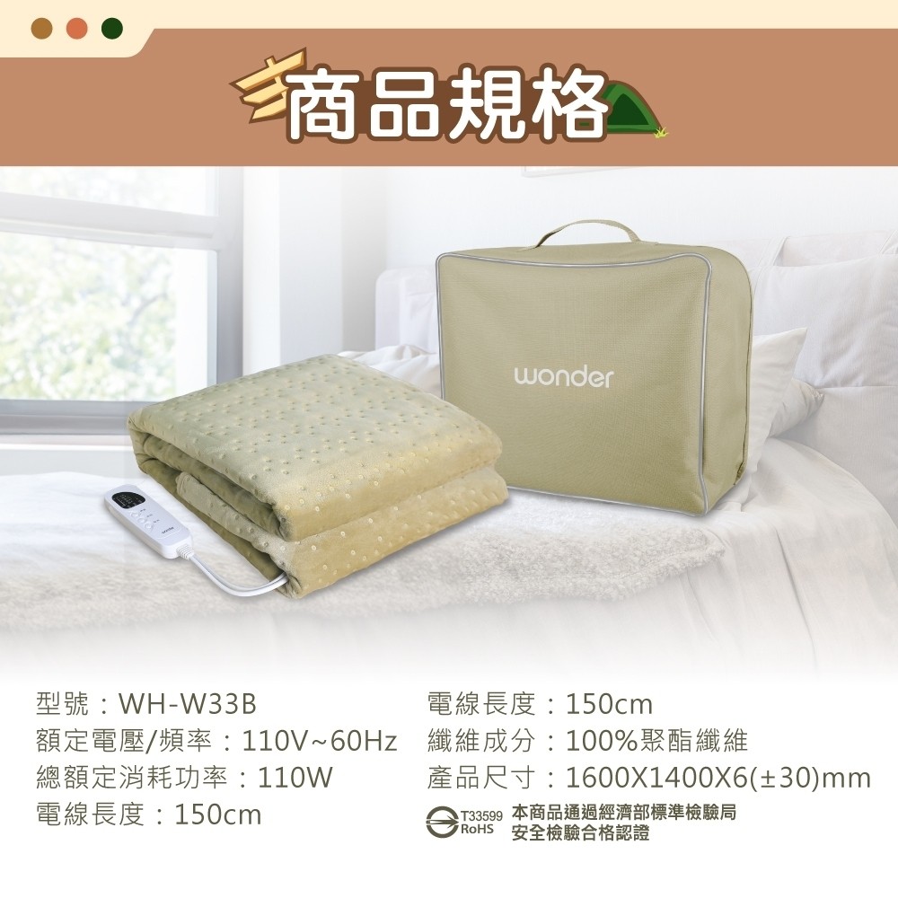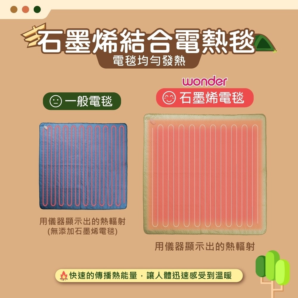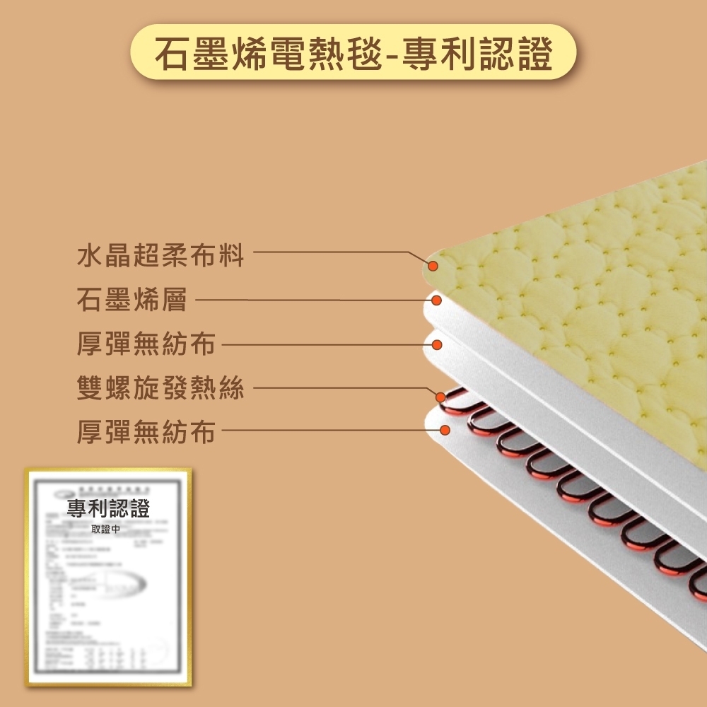 這是電熱毯界的高階頂規商品,添加現在最夯的石墨烯材質,除了讓升溫快速 20 % 之外,更有遠紅外線的功能,除了讓你睡暖暖,更人你睡出健康,不管是戶外露營還是居家生活,迎接即將到來的寒冷冬天,你應該要有這個「石墨烯溫控雙人電熱毯」,台灣商檢局檢驗通過,微電腦控制器,有八小時的定時,五段的溫度設定,過熱自動斷電,家裡面有怕冷的朋友或是老人小孩,可以趁現在下單搶購