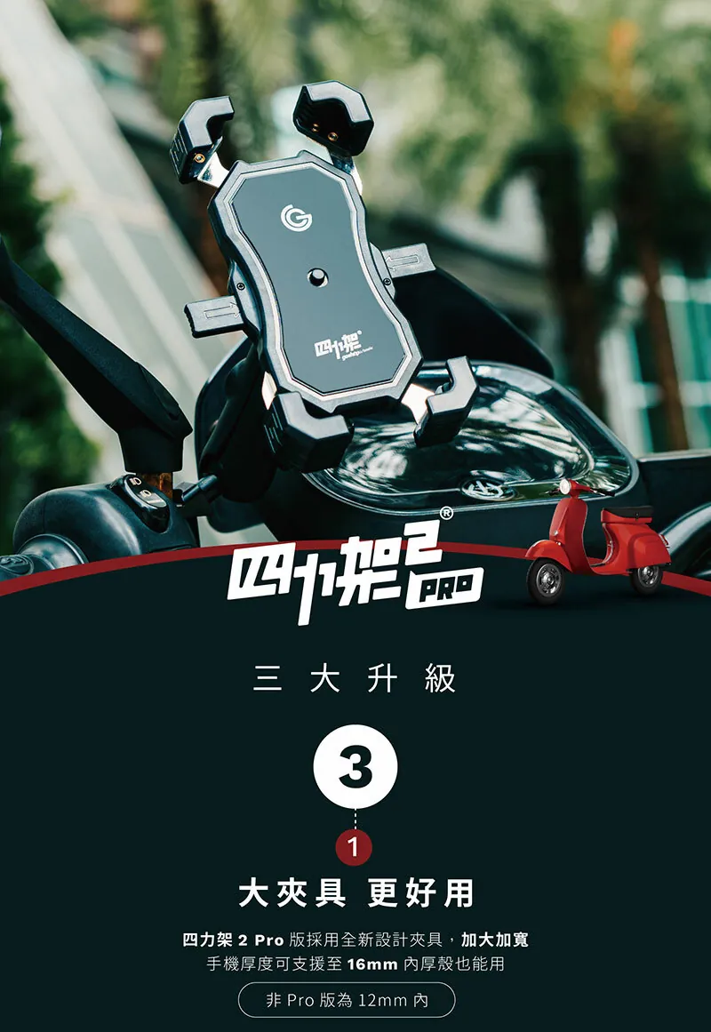 12分鐘前GC 四力架2 / 2s 單手操作 快人一步 最新四力架2 Pro 自動夾緊 USB充電 無線充電兩用機車手機架 外送必備 接單神器 - 四力架2s Pro(快充版)一入組NT$1,180