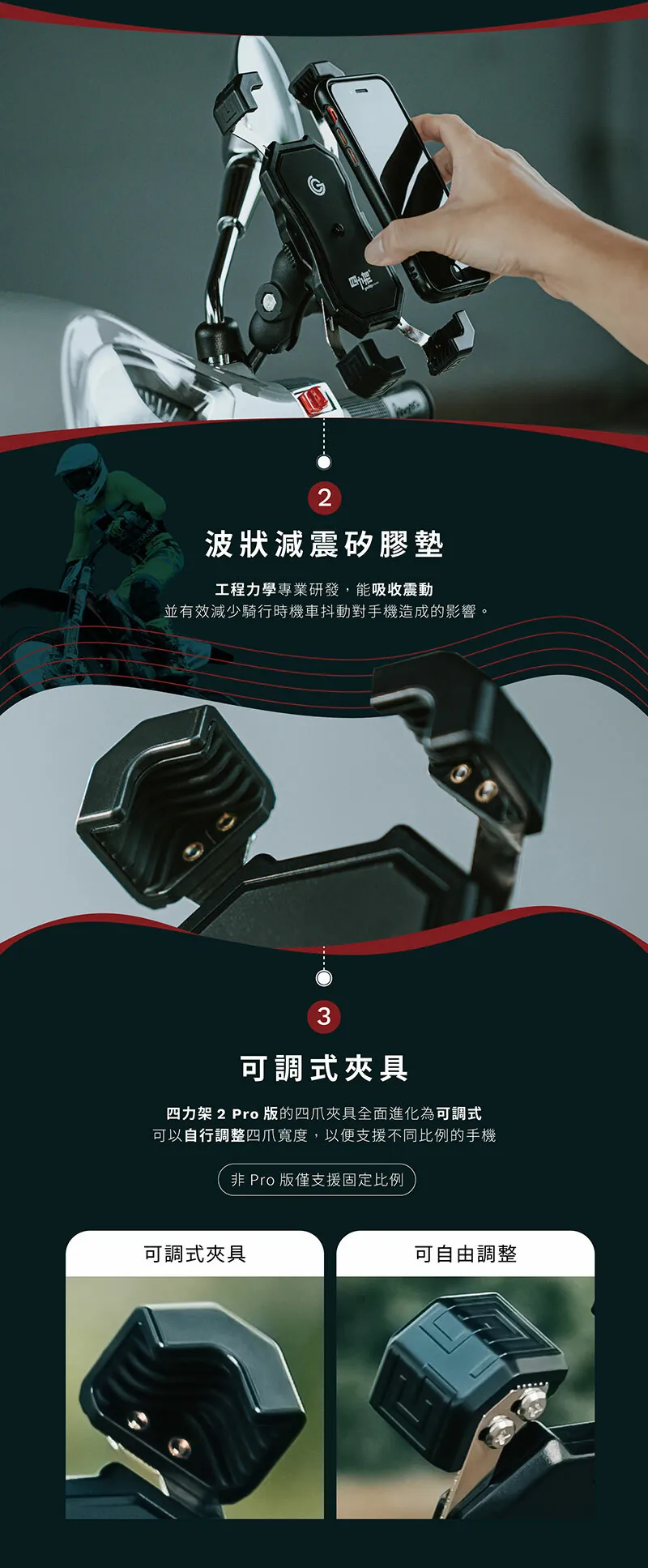 5分鐘前GC 四力架2 / 2s 單手操作 快人一步 最新四力架2 Pro 自動夾緊 USB充電 無線充電兩用機車手機架 外送必備 接單神器 - 四力架2s Pro(快充版)一入組NT$1,180